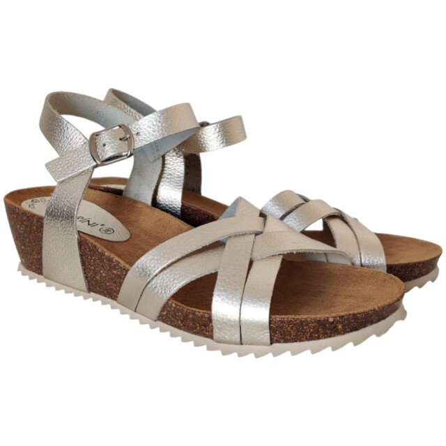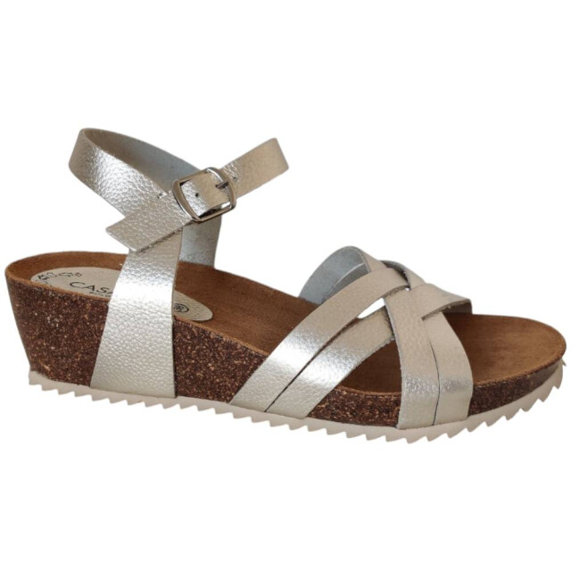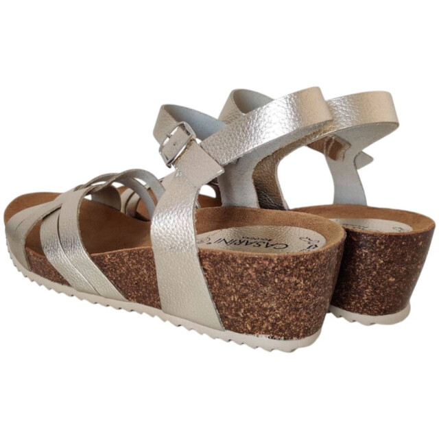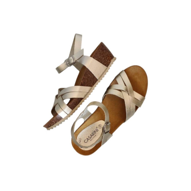 Dames sandaal van Casarini. Sleehak sandaal met gesp sluiting. Materiaal: leer. Voering: leer. Kleur: goud. Zool: rubber. Hakhoogte: ca 5 cm.