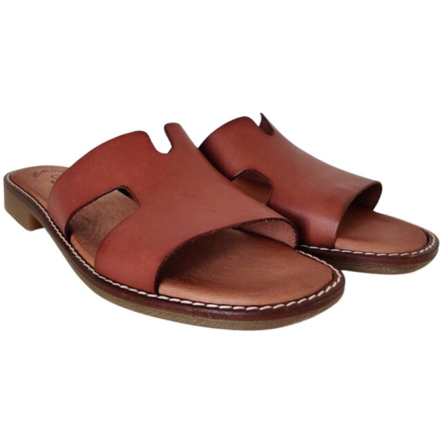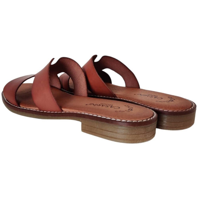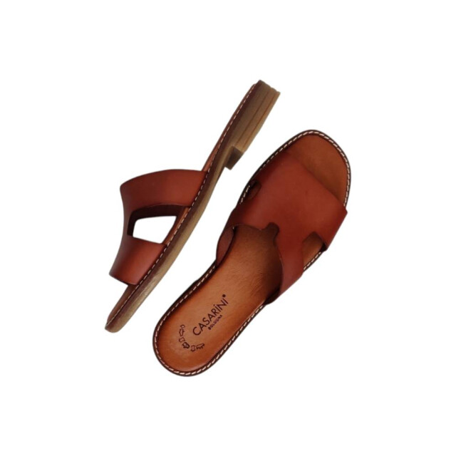 Dames slipper van Casarini. Slipper met brede wreefband. Materiaal: leer. Voering: leer. Kleur: cognac bruin. Zool: rubber. Hakhoogte: ca 1 cm.