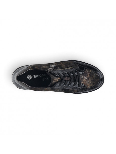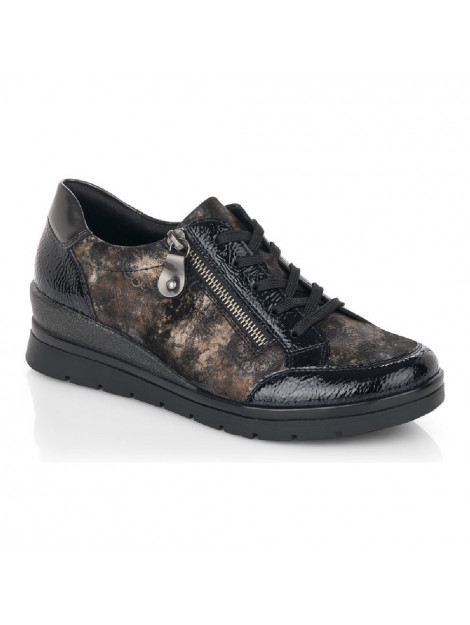 Artikel R0704 in kleur 02-Zwart-Metallic is een prachtige zwarte veterschoen, voor dames, van het merk Remonte. De zool is van rubber. De voering is gedeeltelijk leer. De voetwijdte is G. Deze veterschoen is voorzien van een uitneembaar voetbed.