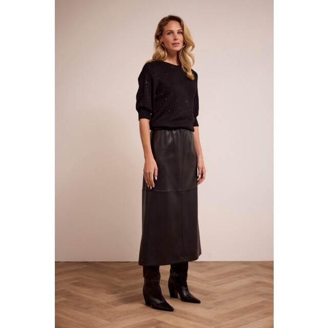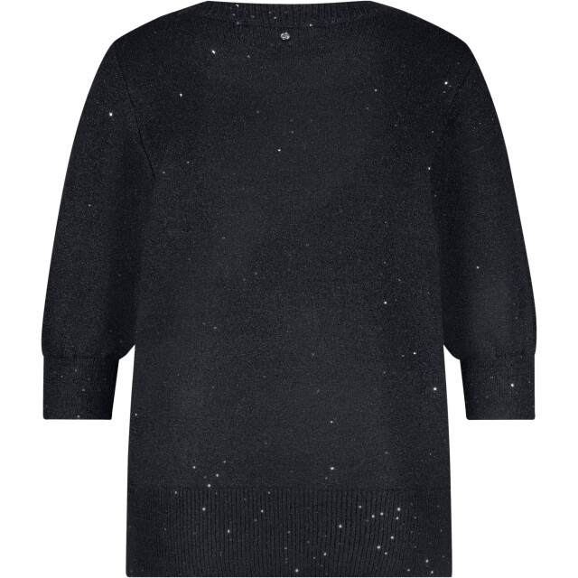 De Tramontana gebreide trui in zwart melange geeft je garderobe direct een luxe touch dankzij subtiele lurex en kleine pailletten die het breisel zacht laten glanzen. Het normale model en de ronde hals zorgen voor een vertrouwde pasvorm die meebeweegt met je dag; de korte mouwen maken het een veelzijdig item om onder een jasje te dragen of solo te tonen. Het lichte mengsel van elastane, acryl en polyester houdt de trui in vorm en voelt aangenaam op de huid zonder te zwaar aan te voelen, waardoor je hem gemakkelijk combineert met verschillende lagen. Je merkt de kwaliteit in de afwerking en het fijnere breisel, dat net genoeg structuur geeft om chic te ogen zonder stug over te komen.